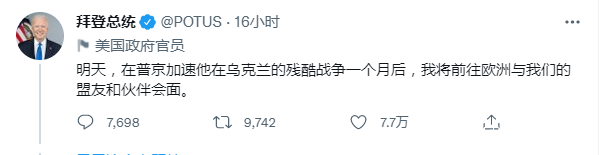 如今拜登終於出發了,23日他在推特上宣稱,將在第二天前往歐洲會見盟友與夥伴,討論烏克蘭的緊張局勢。