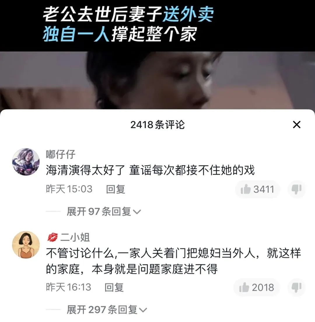 這種評理傾向性還表現出強烈的“互聯網地域性”——在抖音,媳婦的不易與夢想被普遍共情,大姑子是被集體討伐的對象;在小紅書,情況整個逆轉過來,都在為獨立姐姐鳴不平,實在看不慣這貪婪、心機又蠻不講理的媳婦;豆瓣人則自詡理中客,要看出這種兩極化評理的文藝內涵,認定是童謠的演技不及海清,以至於並不很佔理的媳婦反而獲得了更多同情。