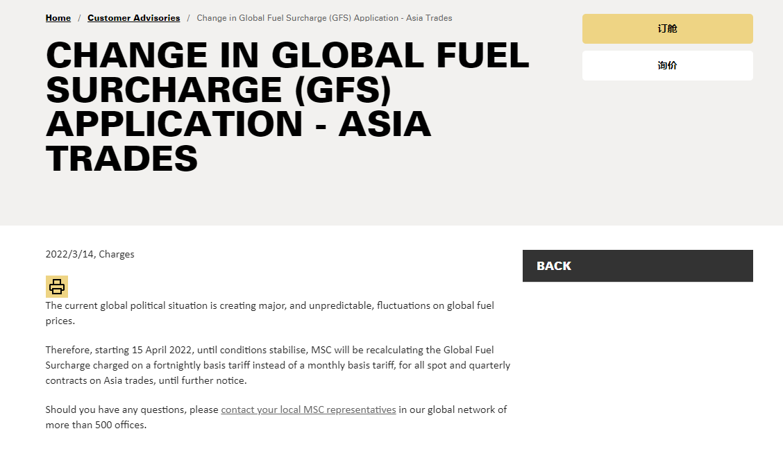 雖然亞歐航線運價下調,但是航運公司方要增收燃油附加費以應對運輸成本上升也已經是板上釘釘的事實。早前UPS聯合包裹、FedEx聯邦快遞和TNT國際快遞就先後將燃油附加費上調至36%和30.5%,地中海航運(MSC)在3月14日也發佈通告稱:「自 2022 年 4 月 15 日起,在情況穩定之前,MSC 將對亞洲交易的所有現貨和季度合約重新計算按兩週而不是按月收費的全球燃油附加費,直至另行通知。」