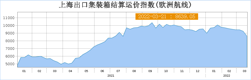 上海航運交易所發佈的上海出口集裝箱運價指數(SCFI)顯示,3月11日至18日,上海出口集裝箱綜合運價指數為4540.31點,同比上期下跌84.75點。近一個月,上海港出口至歐洲基本港市場運價(海運及海運附加費),從7677美元/TEU下跌到7019美元/TEU,跌幅超過8%;截止3月21日的最新數據顯示,上海港口出口至歐洲基本港的集裝箱結算運價指數為8639.05點,同比上期下跌6.7%,上海港口出口至美西基本港的集裝箱結算運價指數依舊為5421.77點,與上期持平。
