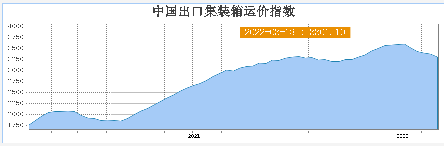 上海航運交易所發佈的中國出口集裝箱運價指數顯示,3月11日至18日,中國出口集裝箱運價綜合指數由3366.01下跌至3301.10點,跌幅達1.9%,其中歐洲航線運價指數為2568.88點,同比上期跌幅達1.9%;美西航線運價指數為2470.76點,同比上期跌幅達3.8%。