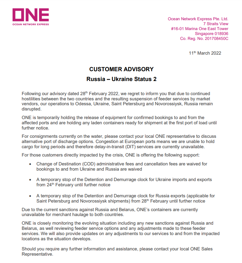 俄烏衝突的影響也是顯而易見的,航運公司暫停了涉及兩國之間的所有相關航運業務。ONE船公司繼2月28日發佈公告後在3月11日重新發布通知稱:「由於兩國之間的持續敵對行動以及由此導致市場供應商暫停支線服務,我們在烏克蘭敖德薩、聖彼得堡和俄羅斯新羅西斯克的業務仍然中斷。」