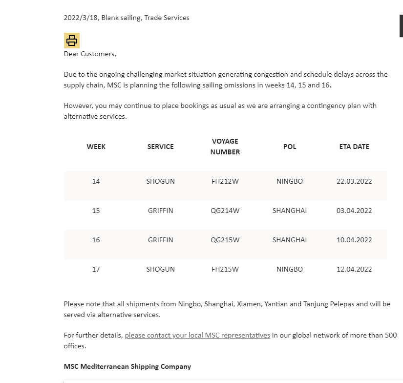2M運營商馬士基以及地中海航運(MSC)日前宣佈了4月份的三班無效航次,地中海航運(MSC)將其歸因於持續充滿挑戰的市場形勢。地中海航運(MSC)計劃在第14、15和16周取消以下幾次航行,不過該公司已經安排其他服務的應急計劃,客户可以根據自身的需求選擇相對應的預訂。