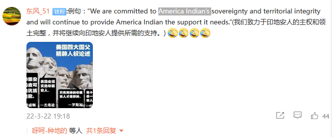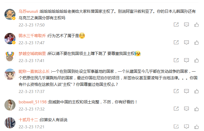 還有網友嘲諷説,一個在別國到處設立軍事基地的國家,一個從建國至今幾乎都在發動戰爭的國家,一個把原住民幾乎屠戮殆盡的國家,“最近你國在尼泊爾的項目,所籤協議甚至要凌駕於當地法律……你國有什麼資格在這教別人談‘主權’?你國尊重過他國主權麼?”
