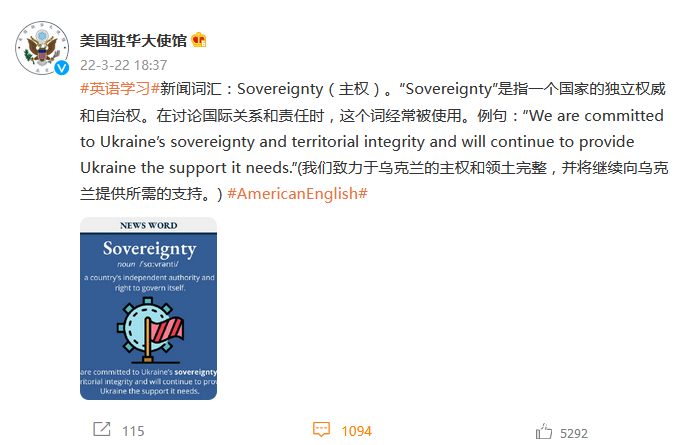 3月22日,@美國駐華大使館 又在微博上教中國網友英語,由於這次學的詞——“Sovereignty(主權)”過於諷刺,引發了中國網友的羣嘲。