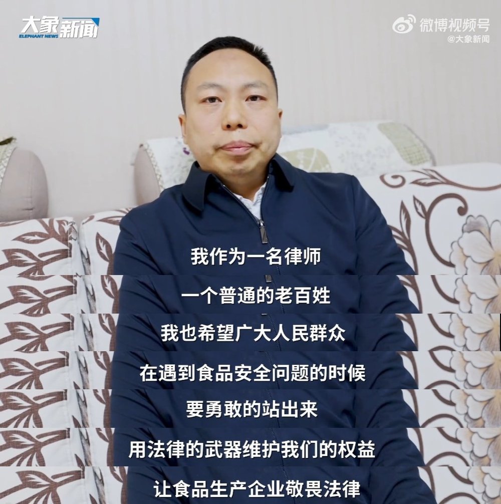 這位律師還表示,希望這一次他能夠以自身為實例,讓大家能過在遇到類似的食品安全問題的時候,勇敢的站出來,用法律維護我們自身的權益,讓食品公司能過敬畏法律。