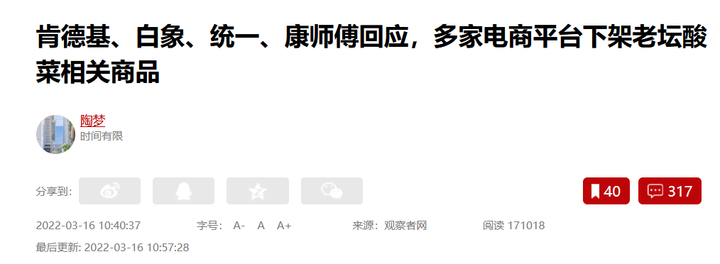 觀網的相關報道:《肯德基、白象、統一、康師傅回應,多家電商平台下架老壇酸菜相關商品》