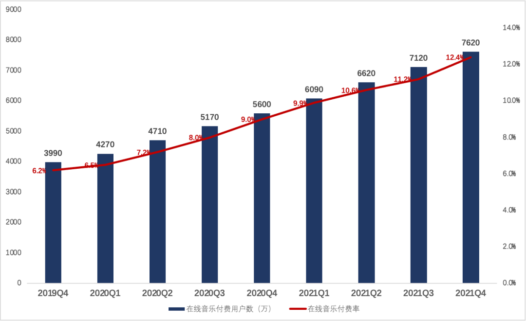 (2019年Q4-2021Q4 TME在線音樂付費用户數與付費率)