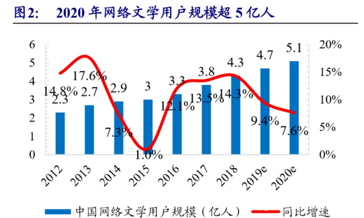 2020年,網絡文學市場規模超過200億元,用户數量超過5億。在線閲讀包含了數字公共出版物、電子書、漫畫、網絡文學等內容創作形式。