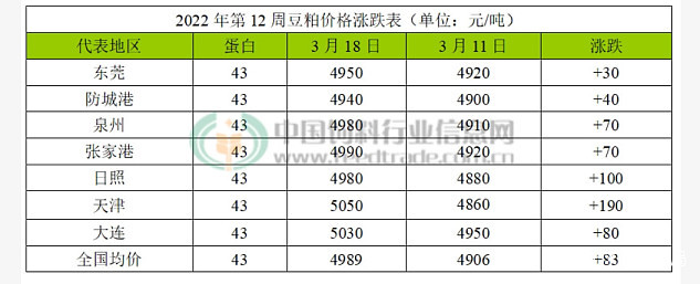 2022年第12周豆粕價格漲跌表 來源:中國飼料行業信息網