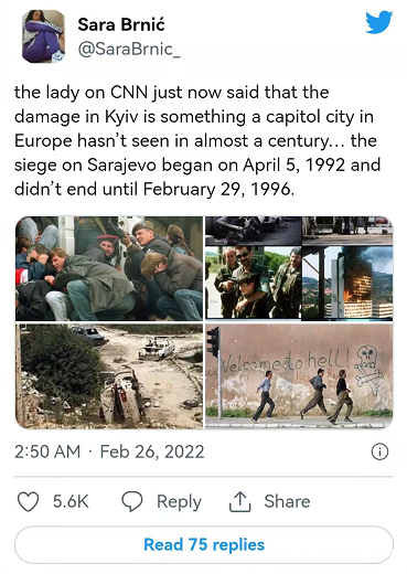 △塞爾維亞網友痛斥美媒無知:美國有線電視新聞網(CNN)説基輔受到的破壞是歐洲首都城市近百年所未見,但薩拉熱窩在90年代可是被圍困了四年之久。