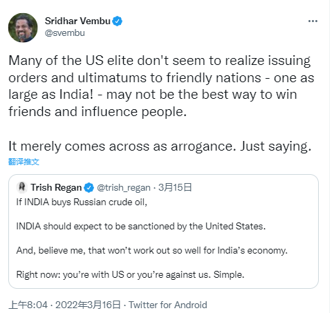美國福克斯商業頻道女主播翠西·里根15日也在社交媒體上發文稱,“如果印度購買俄羅斯原油,應該受到美國製裁。這對印度經濟來説不是好事。現在(印度面臨的選擇)是支持美國還是反對美國,這很簡單。”印度富商、軟件公司Zoho創始人斯里達爾·芬布隨後轉發該帖文寫道,“許多美國精英似乎沒有意識到,對一個像印度這樣大的友好國家發號施令和下達最後通牒,可能不是贏得朋友和影響他人的最佳方式。只能給人傲慢的印象。”