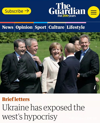 △英國 《衞報》刊文説,烏克蘭暴露了西方的偽善。