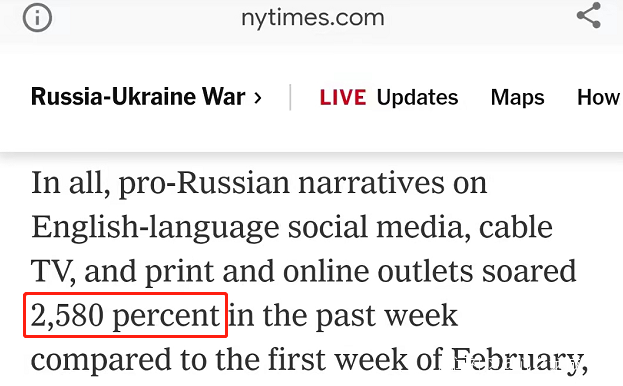 △《紐約時報》文章説,2月末,英文社交媒體上,挺俄言論相比2月初漲了25.8倍。