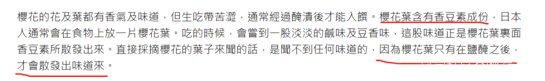 其實櫻花本身就沒啥味道,非常清淡,如殘影抓不住。更大程度上,櫻花只是用來裝飾,反倒是櫻花的花葉在發揮氣味作用。經過乾燥、鹽漬後,破壞其內部的細胞結構,分解出香豆素特有的味道,淡淡鹹鹹,一股豆香味。