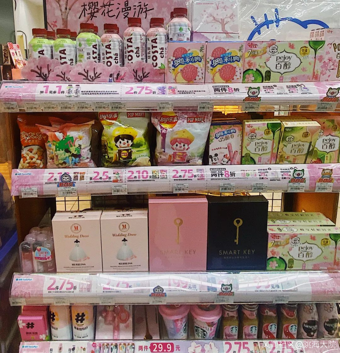 憶往昔,前不久我去便利店購買一瓶寡淡的礦泉水,也要先經過門口的大展示櫃,接受一整個櫻花味限定大沖擊。
