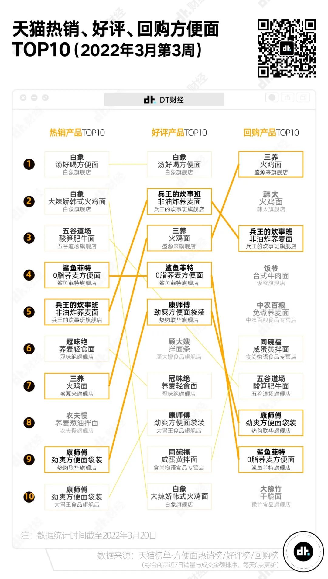 我們對比了天貓方便麪熱銷榜、好評榜和回購榜上的TOP 10產品,發現在回購和好評的榜單中,熱銷榜中的部分產品排名下降,甚至落榜。