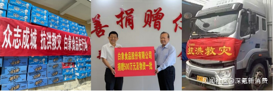 2020年新冠疫情爆發,白象捐款500萬元;2021年河南鄭州遭遇特大暴雨,白象第一時間緊急捐贈30000餘份方便麪,搬空了各地倉庫的同時,默默捐款500萬元。