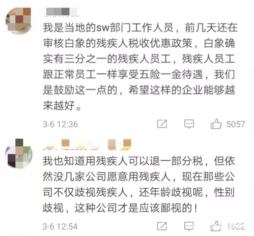 外界曾有聲音質疑白象這麼做,是為了逃避繳納殘疾人就業保障金。根據政策規定,中國的企業需要按照員工人數1.5%的比例繳納殘疾人就業保障金,不想交這個錢,就按照在職人員1.5%的比例招收殘疾人。
