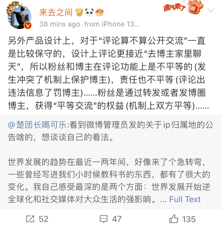 我猜測微博是基於這樣的思考,做了顯示海外用户IP這樣的功能。初衷可能就是通過信息的透明化,消除在討論中的誤會,區別觀點分歧和攪渾水帶節奏兩種截然不同性質的行為。