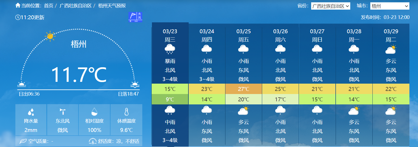 同時我還看了一下氣象台上放出的梧州最近的天氣情況,今天梧州那邊好像在下暴雨,隨後基本一直都在下小雨,一直要到下週二(3月29日)才會開始放晴。
