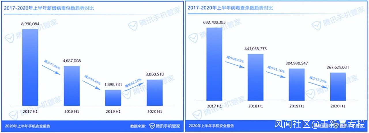 過去第三方應用商店雖然給用户帶來了更加多元化的APP選擇,但在安全與隱私防護層面有所欠缺,在第三方應用商店佔據主導的時代(2011年~2017年),也是手機病毒、惡意軟件與山寨APP氾濫的時代。(下圖為騰訊手機管家安全報告截圖)