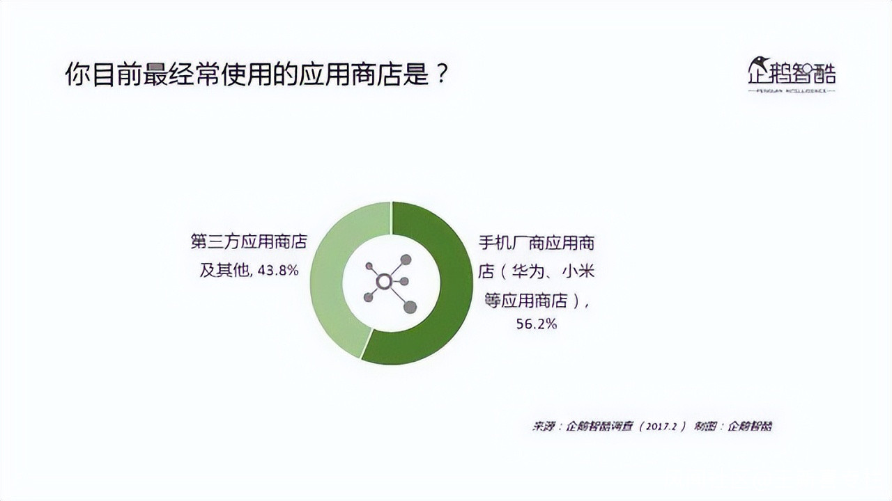 而到了2017年,根據企鵝智庫的數據調查顯示,在用户最常使用的應用商店中國,手機廠商應用商店(小米、華為等應用商店)已經佔比達到56.2%。超過了第三方應用商店。