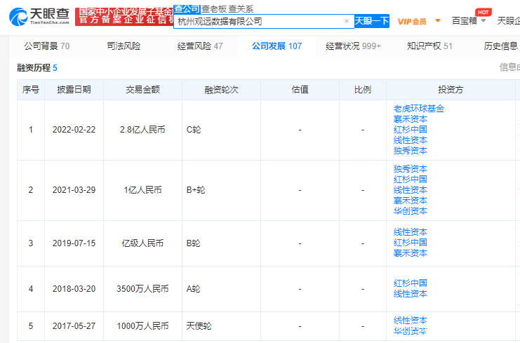 據天眼查數據顯示,以BI作為發展方向的觀遠數據,在2月22日完成了由老虎環球基金(Tiger Global)領投,紅杉中國、線性資本、襄禾資本、獨秀資本(Unicorn Capital Partners)等老股東跟投的2.8億人民幣C輪融資。