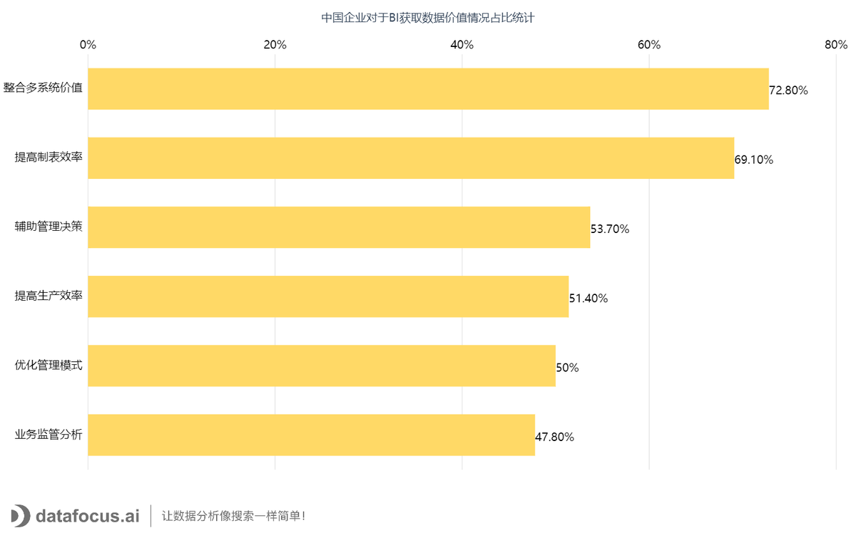 同樣的,在當前國內企業應用BI產品中,企業最期待獲得的數據價值,數據整合、提高製表效率、輔助管理決策排名前三。