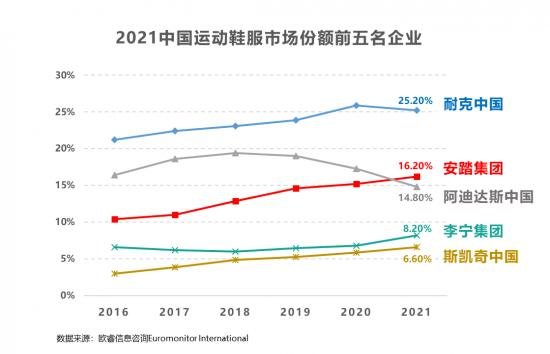 從企業整體的市場份額來看,據歐睿信息諮詢統計數據,安踏的市佔率已經從第3位上升至第2位,以16.2%的市場份額超越了阿迪達斯的14.8%,並與耐克的差距進一步縮小。