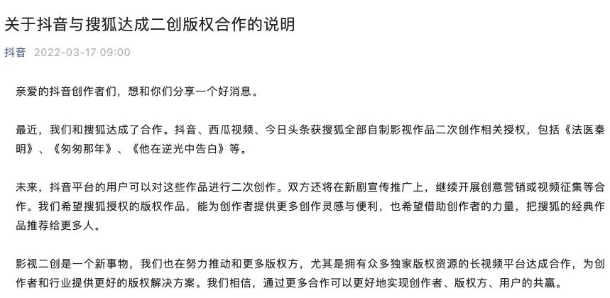 3月17日,長短視頻迎來歷史性的握手時刻——抖音率先宣佈與搜狐達成合作,獲近搜狐全部自制影視作品和綜藝節目的二創授權,包括《法醫秦明》、《匆匆那年》、《逆光中告白》等優秀作品。抖音平台和用户可對這些影視作品進行5分鐘之內的剪輯、編排或改編。