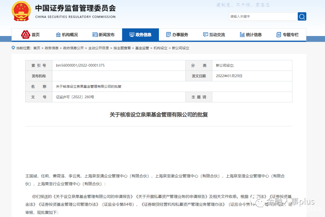 今年1月29日,證監會發布《關於核准設立泉果基金管理有限公司的批覆》,泉果基金正式獲准設立,發起股東為東方紅資管原董事長王國斌和原董事長任莉等人。
