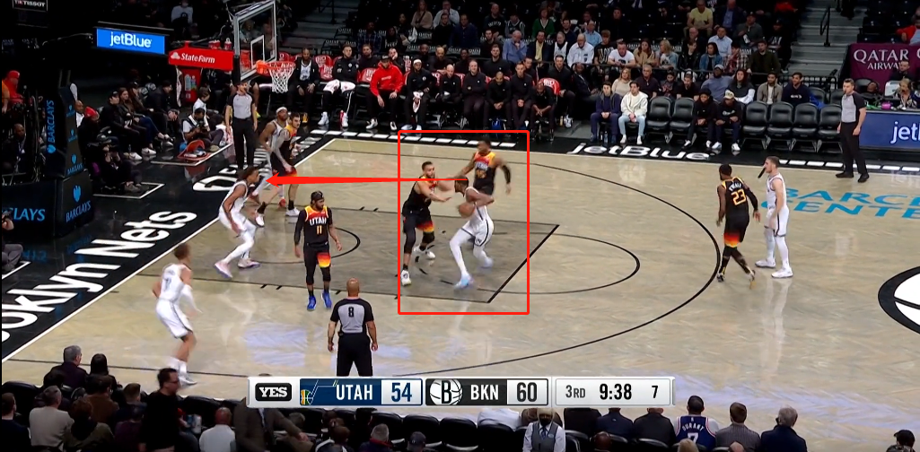 今天打爵士也是如此,比賽的分水嶺就在第三節。爵士改了防守策略,杜蘭特發起擋拆的時候,戈貝爾防到了三分線的位置,他選擇來幫自己的隊友協防杜蘭特。