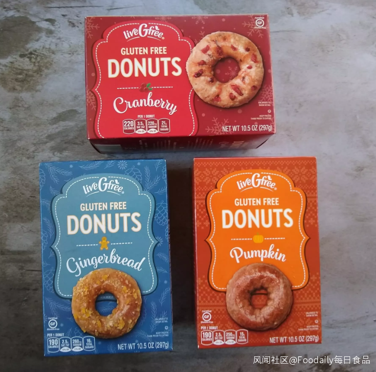 一款無麩質的甜甜圈,這些冷凍無麩質假日甜甜圈深受天天愛好者喜愛,可以大膽享受無麩質飲食帶來健康益處,如改善膽固醇水平,增加能量水平。該甜甜圈有蔓越莓、薑餅和南瓜三種口味。