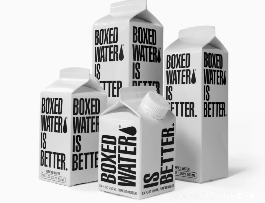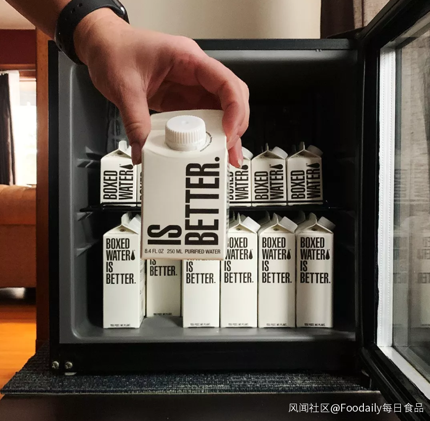 這是一款盒裝純淨水,100%純淨水,與瓶裝純淨水唯一的區別是水裝在紙盒子裏,100%可回收,是一種可再生和可持續的資源。與塑料瓶相比,碳排放量減少了64%。該公司一直致力於可持續設計,突出環保主題。