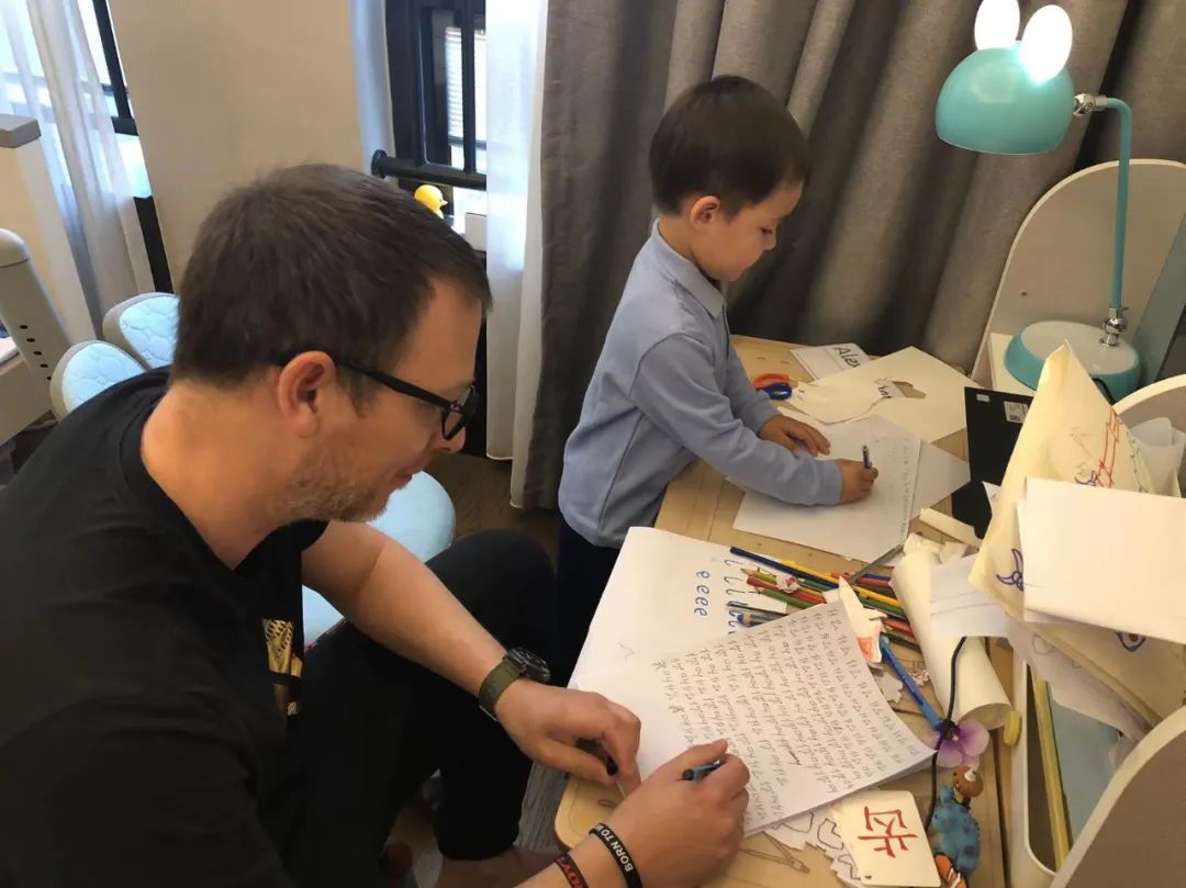 因為時差原因,他上午工作安排比較少,所以乾脆上午和娃一起學習。娃在畫畫,他在一旁學中文,看起來挺父慈子孝的。