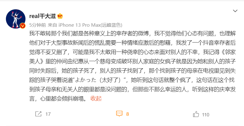 “不要用僥倖來面對別人的不幸,對於那些不那麼幸運的人而言,聽到這樣的慶幸發言,心裏都會傾斜坍塌。”