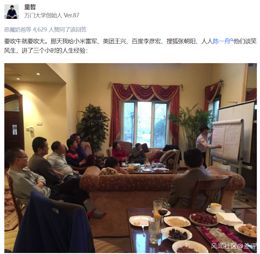 只能説,確實是童哲的風格,畢竟他自己也曾經在知乎上吹噓過,自己跟雷軍、王興、李彥宏他們談笑風生的事兒。