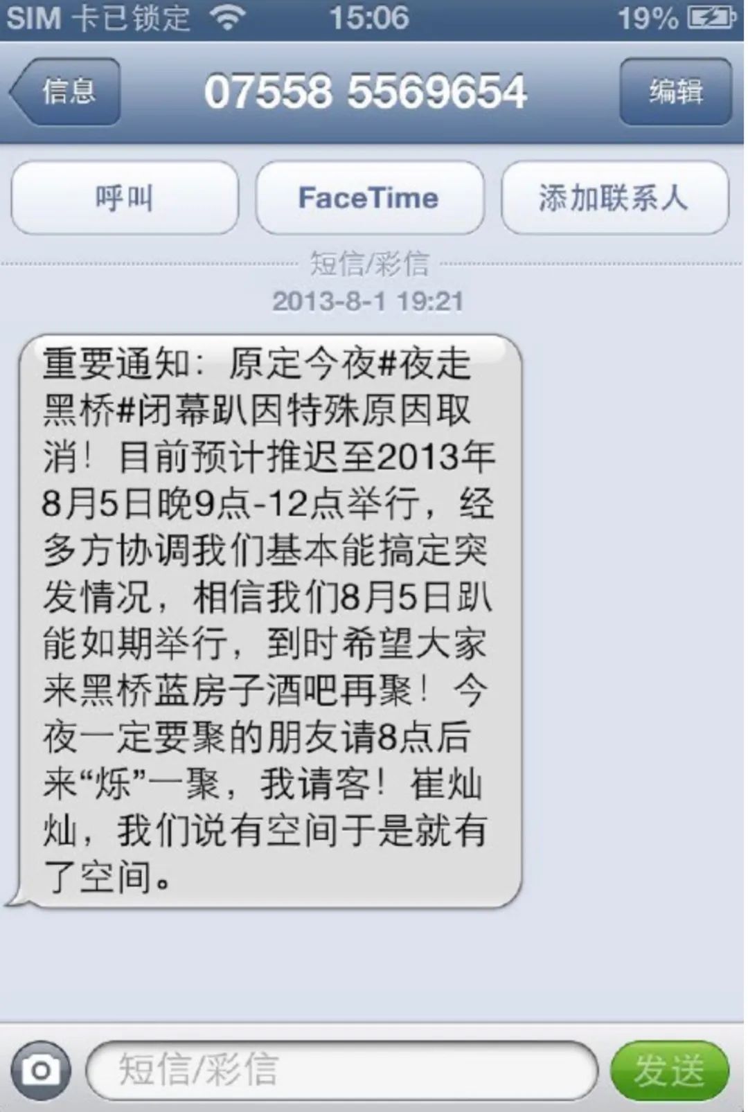「夜走黑橋」最後一件作品是在8月1號,當時我們準備做一個閉幕party,結果就有一件作品是假裝我給所有人發信息,説今天晚上的party取消了,大家如果要喝酒就去旁邊的一個酒吧,記在崔燦燦賬上。