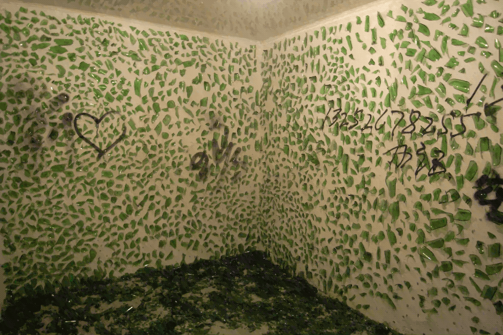 有人在牆上貼滿玻璃,第二天又有人把玻璃組成了一個雕塑,第三天有人把雕塑扔了,再放進去蚊香。