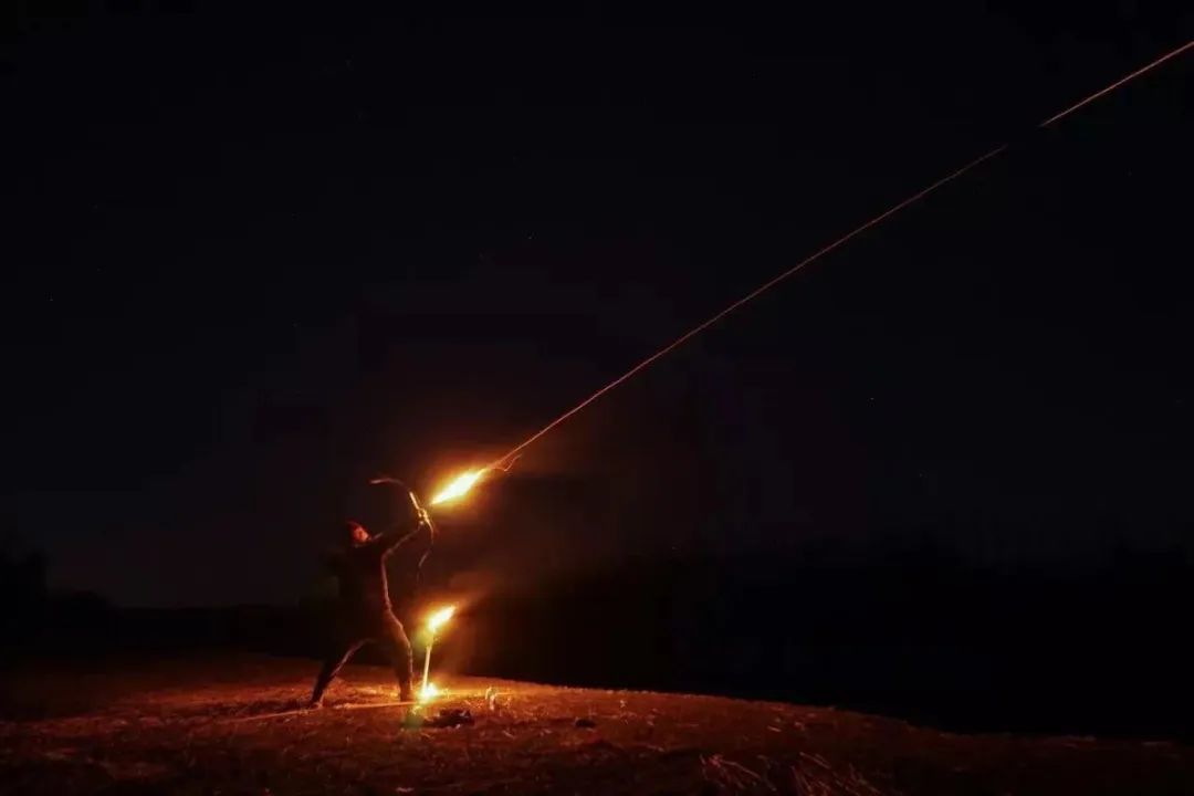 有一個藝術家宗寧在河邊的夜晚射箭。