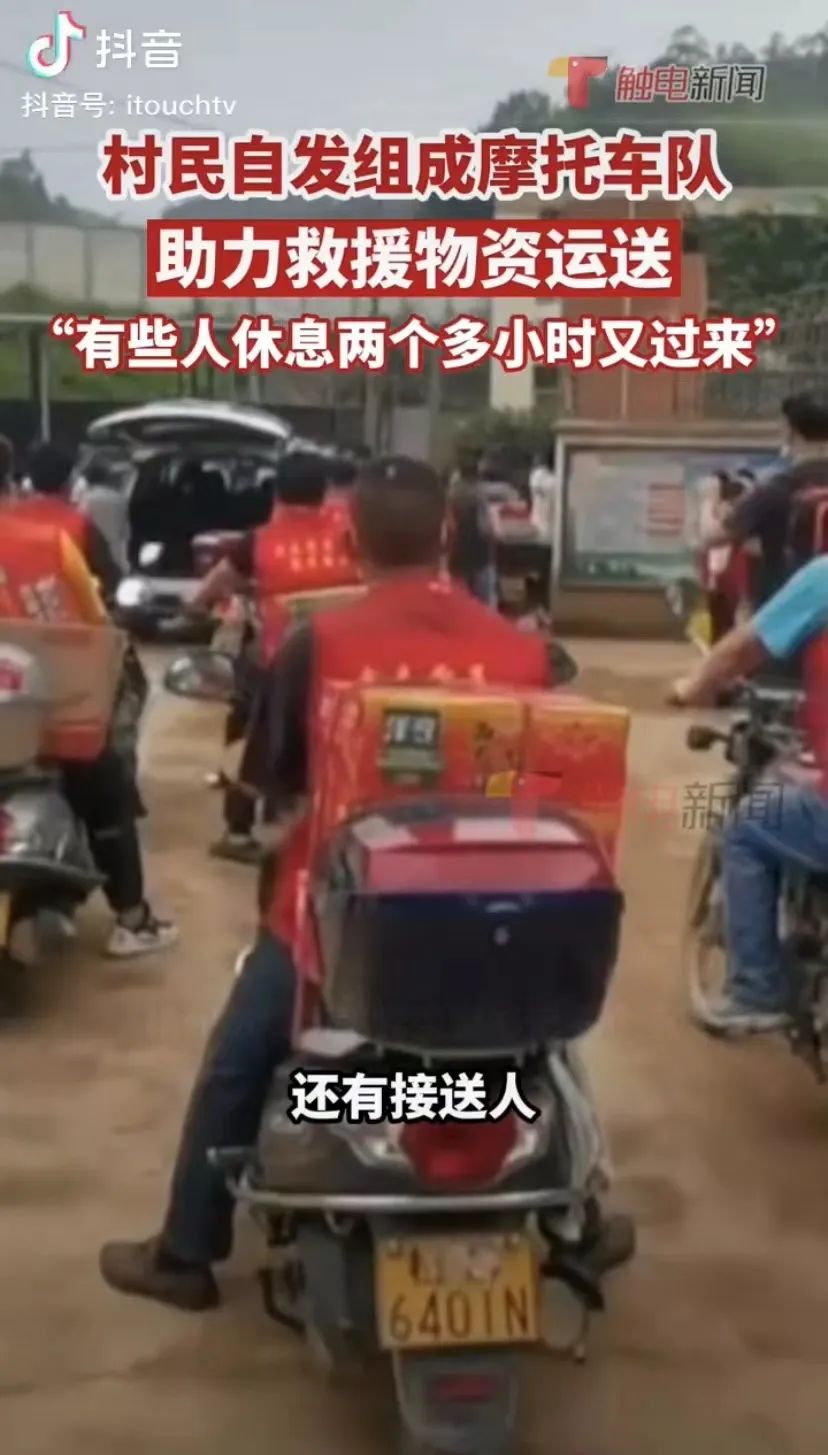 村民自發組成摩托車志願隊伍,驅車40公里,不斷將帳篷、礦泉水、食物等物資送往搜救現場。