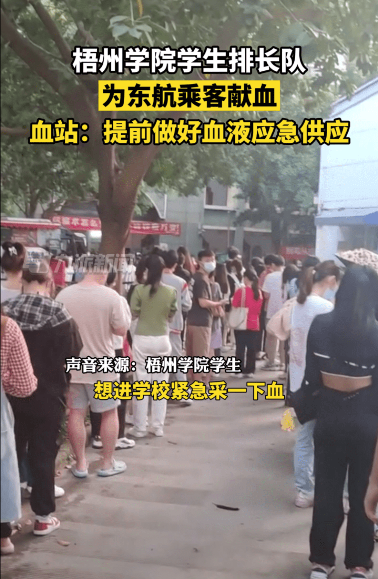 當地血站為血液應急提前做準備,需要血液。廣西梧州學院的學生看到消息,在獻血車前排成了長龍,展現着青年大學生樸素的善意。