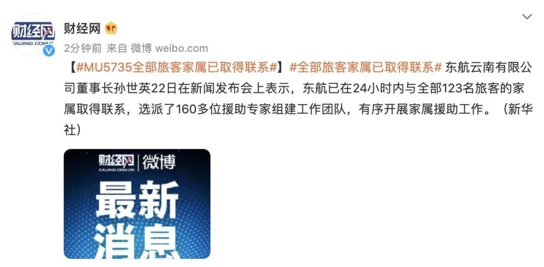 目前,東航已在24小時內,與全部123名旅客家屬取得聯繫,選派了160多位專家,開展家屬援助工作。