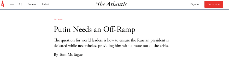 ▲《大西洋月刊》近日刊載了其駐倫敦特約撰稿人湯姆·麥克塔格題為“普京需要一條出路”的文章。