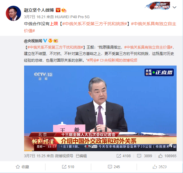 ▲3月7日,在媒體發佈國務委員兼外長王毅對中俄關系表態的視頻之後,外交部發言人趙立堅在社交平台上轉發相關視頻,並且配文稱:“中俄合作沒有上限”。