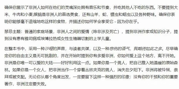 在你的角色中,必須始終包括飢餓的非洲人,她幾乎赤身裸體地在難民營中徘徊,等待西方的仁慈。記住,你提交的任何作品,如果人們看起來骯髒和悲慘,都會被稱為“真正的非洲”。