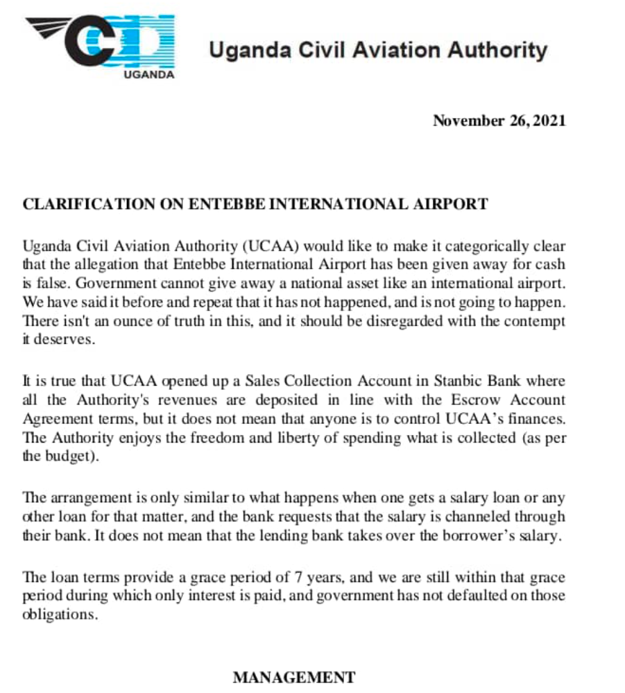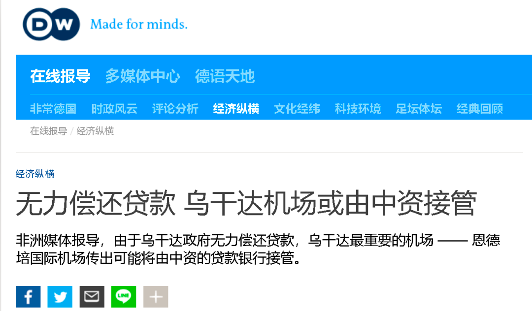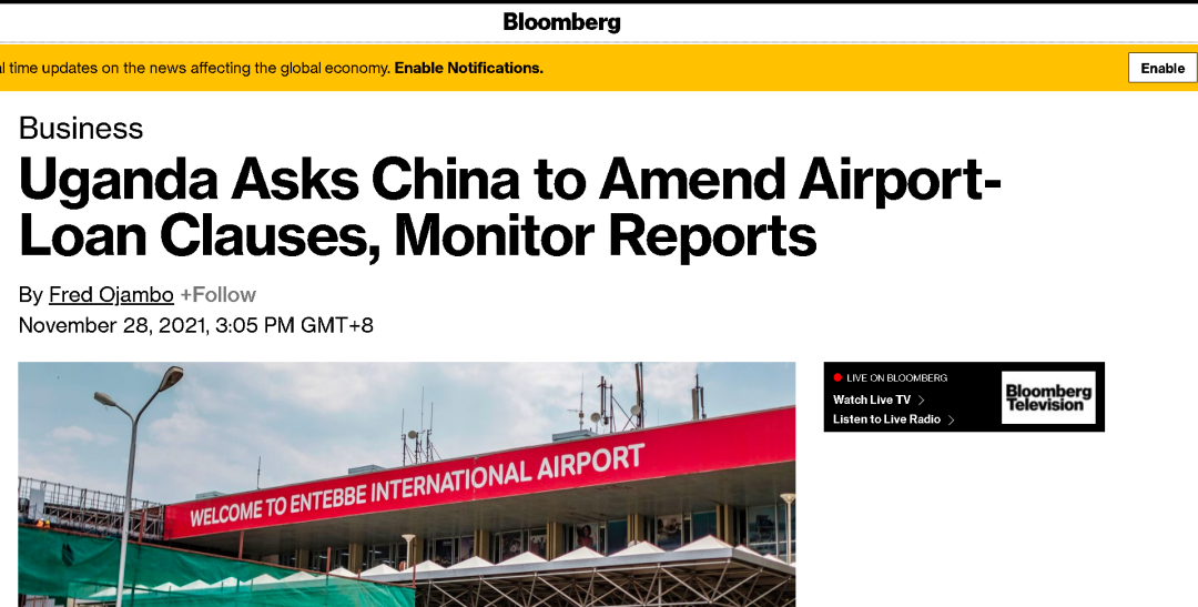 2021年在11月,西方媒體炒作所謂的烏干達-中國不平等條約,稱烏干達為了翻新國內唯一機場,和中國約定:只要烏干達還不起錢,機場就要抵押給中國。