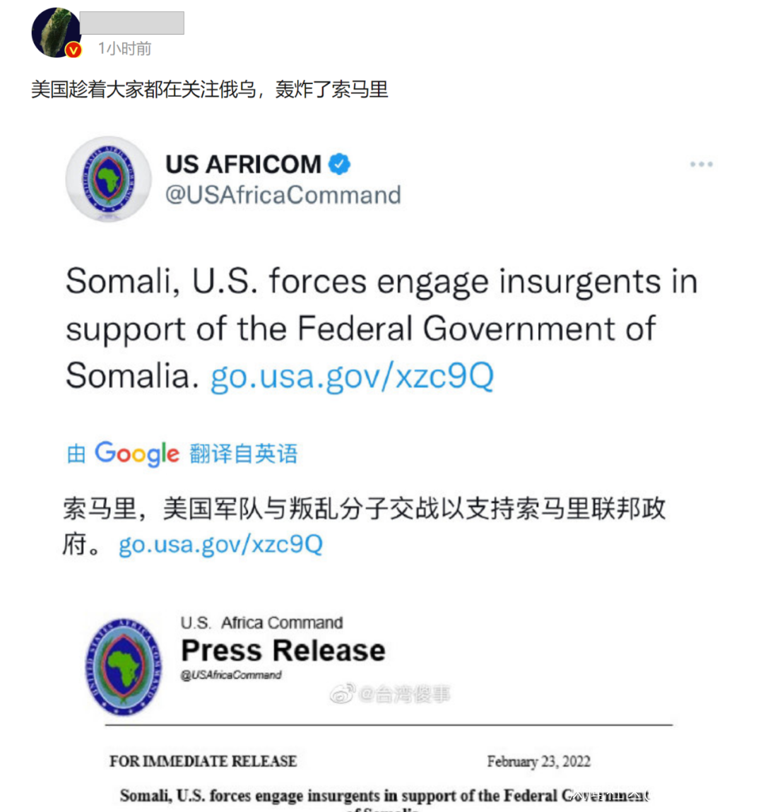 2022年2月24日,美國趁着俄羅斯和烏克蘭交戰,悄悄轟炸了索馬里。