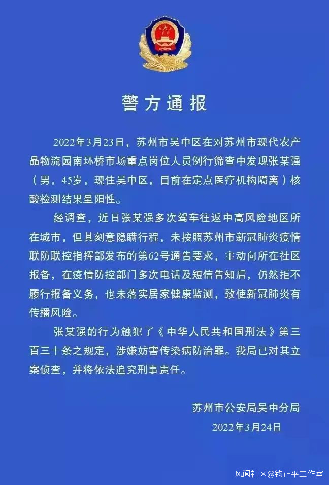 近日,蘇州一男子多次駕車往返中高風險地區所在城市,但其刻意隱瞞行程,未主動向所在社區報備,在疫情防控部門多次電話及短信告知後,仍然拒不履行報備義務,也未落實居家健康監測。最後該男子被公安機關立案偵查,並將依法追究其刑事責任。